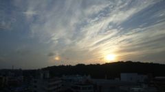 豊見城市から見て西向け、午後6時前、夕日の左側に謎の光がありました。
