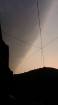 5/11PM6:30頃、堺から大阪市内の自宅への帰り道で、運転中の主人が「地震雲や!」と言ったので、後ろに座っていた娘が携帯で写真を取りました、左側の空に見たことも無い雲がくっきりと浮かんでいました。夕焼けにはえて綺麗だけど、何か不気味に感じました。翌日に中国で大きな地震があったので驚きました。